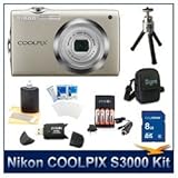 Nikon CoolPix S3000 Digital Camera (Silver), 12.0 Megapixel, 4x, 27-108mm Equivalent Zoom, 2.7" LCD, Video with Sound, 8 GB Memory Card, Card Reader, Battery, Digpro Deluxe Carrying Case, Tripod, Screen Protectors, & Lens Cleaning Kit Don't miss
