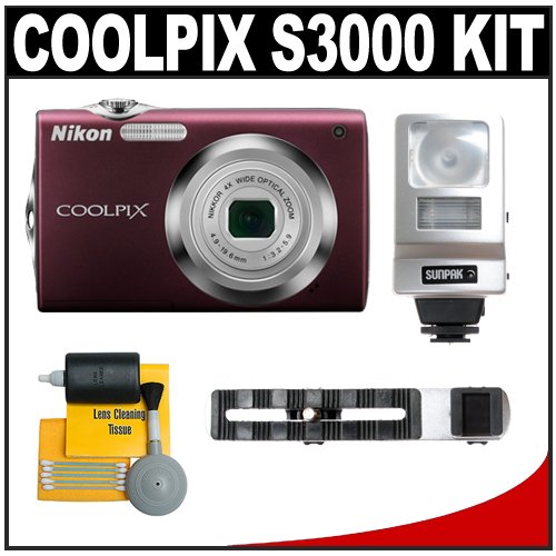 Cheap Nikon Coolpix S3000 12.0 Megapixel Digital Camera with 4x Optical Zoom (Plum) with + Flash + Cleaning Kit Discount Review Shop