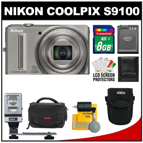 "Nikon Coolpix S9100 12.1 MP Digital Camera (Silver) with 8GB Card + Battery + (2) Cases + Flash + Cleaning Kit" Overview